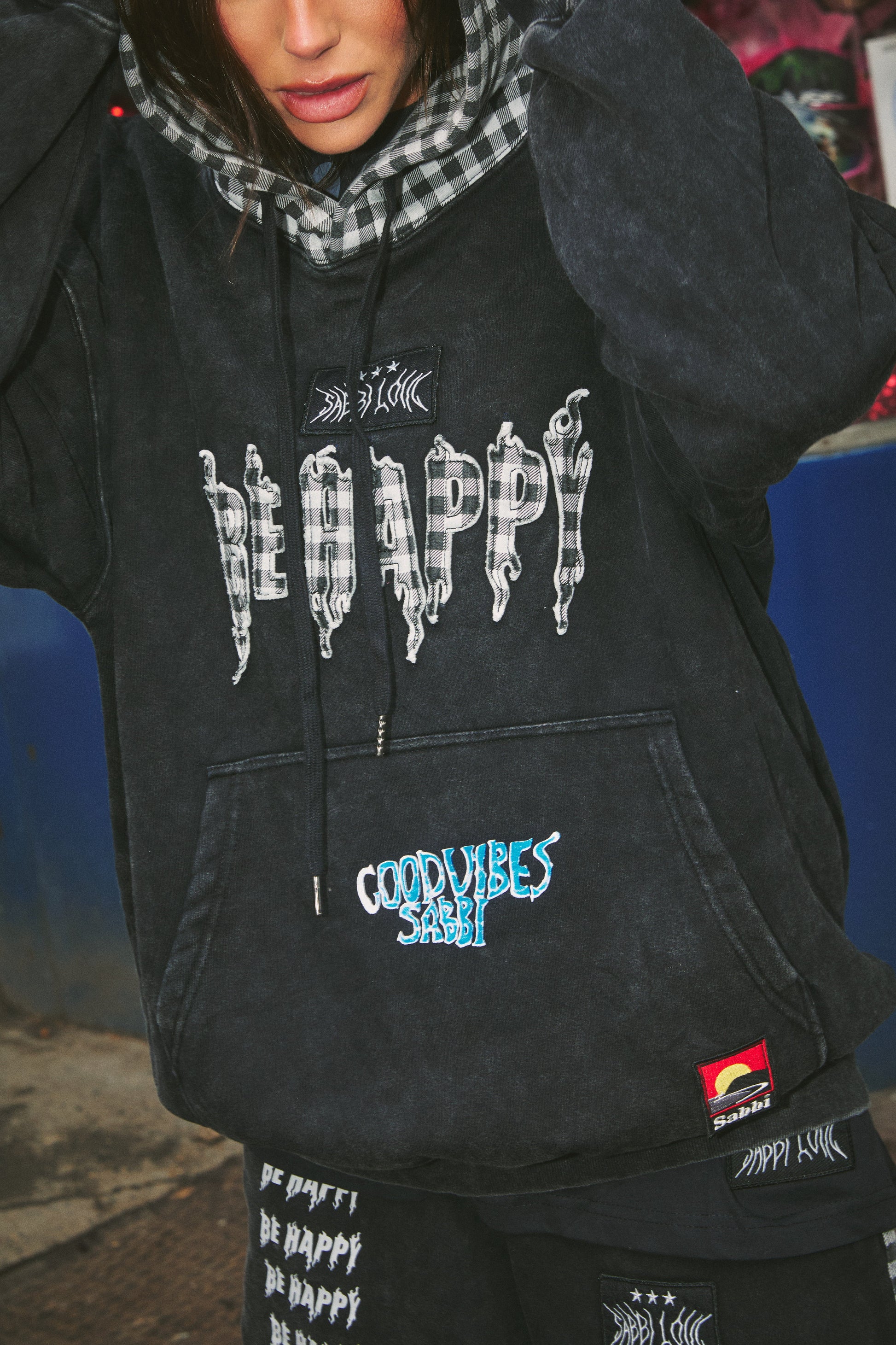 The standout gingham hood adds contrast and attitude, while the BE HAPPY graphic artwork keeps the message loud. Finished with signature Sabbi details and a classic kangaroo pocket, it’s the hoodie you’ll throw on and never want to take off.